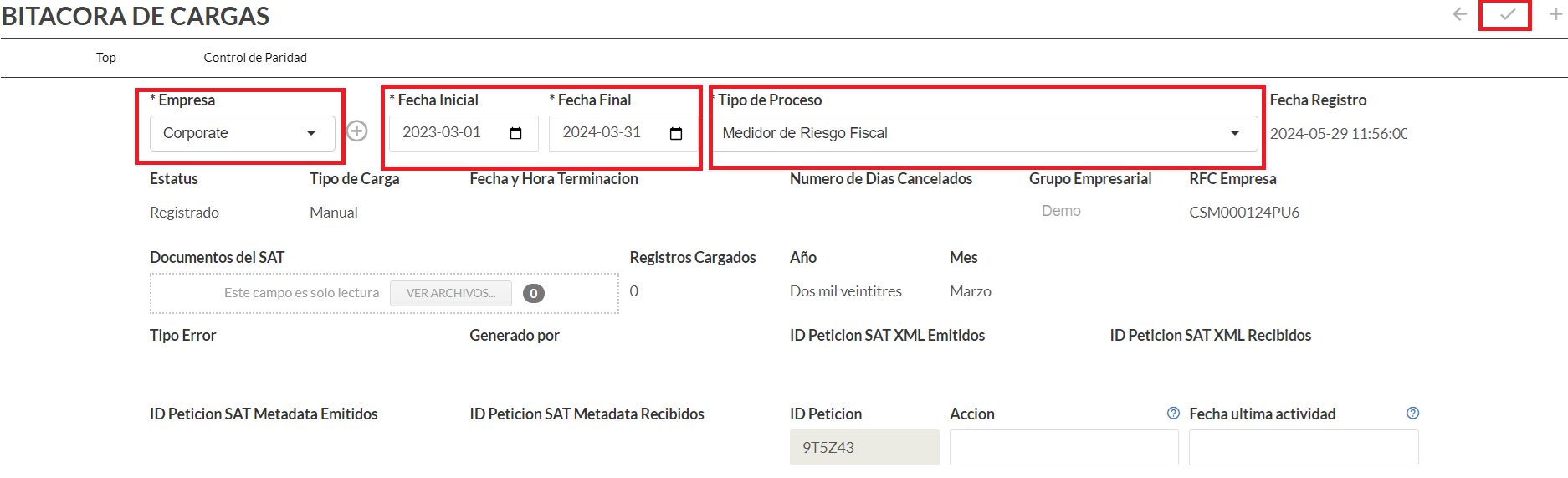 Se te indica la relación a la empresa donde fue identificado el movimiento, factor de riesgo, ejercicio, periodo, la bóveda de donde provienen los documentos, así como la fecha que corresponde.