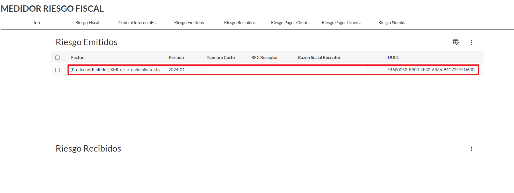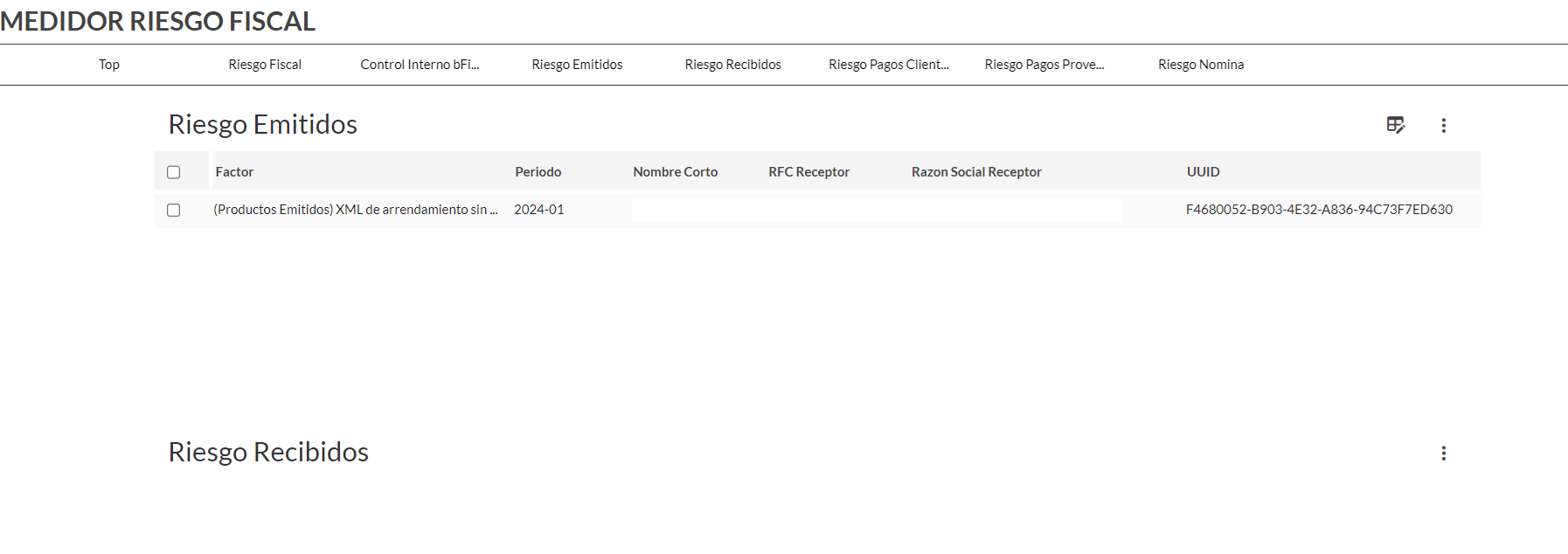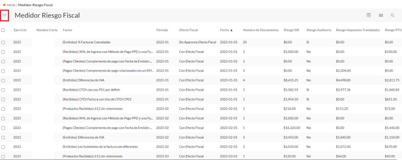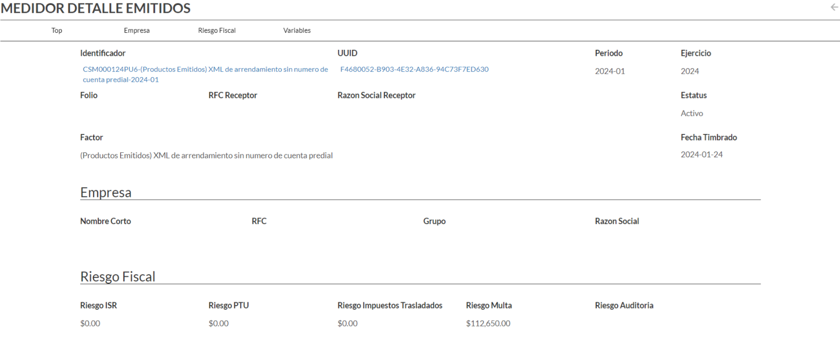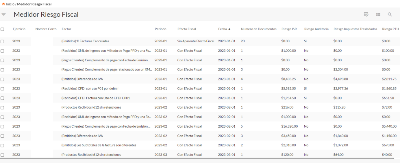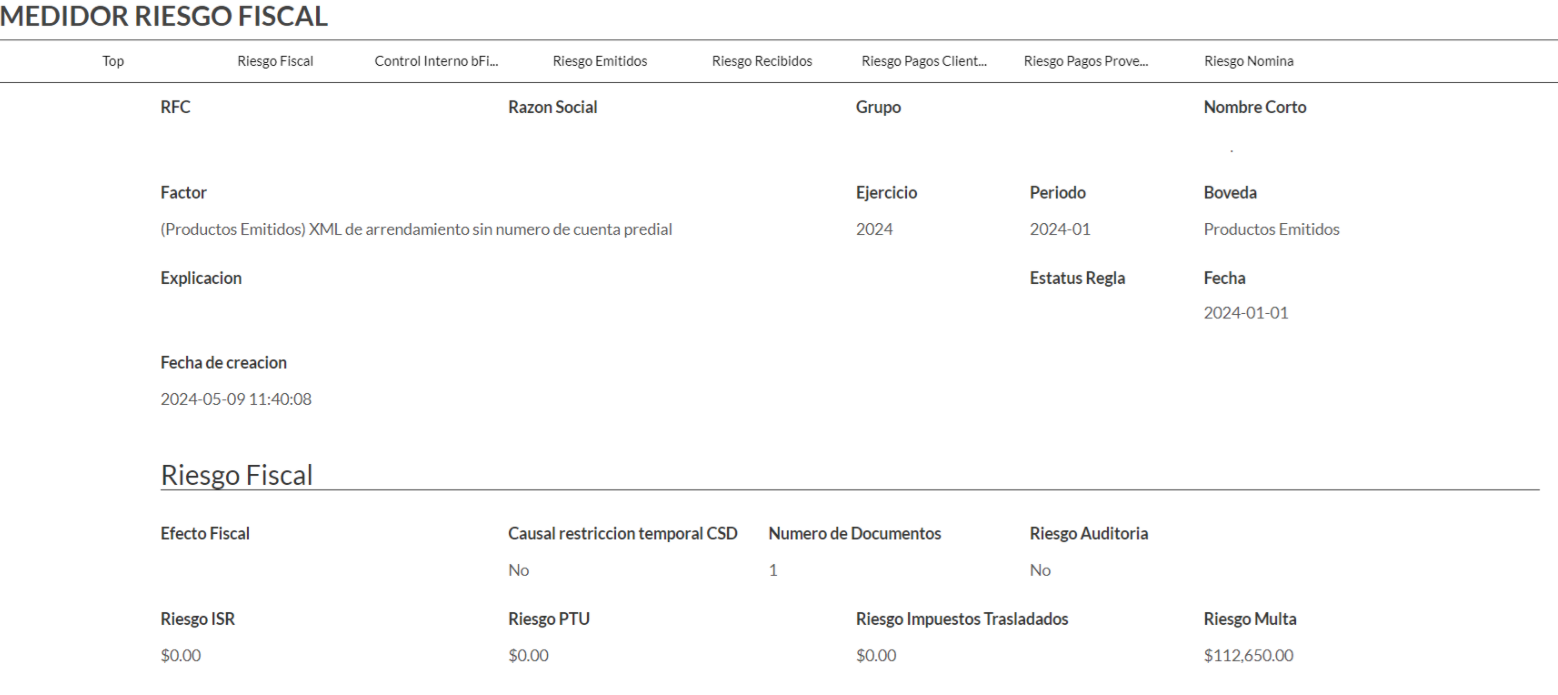 Te enlazara específicamente al medidor detalle, donde encontraras el dato del identificador de riesgo relacionado, UUID, periodo, ejercicio, folio, RFC receptor, razón social receptor, estatus de la factura, factor, fecha de timbrado, datos de la empresa y datos del riesgo fiscal.