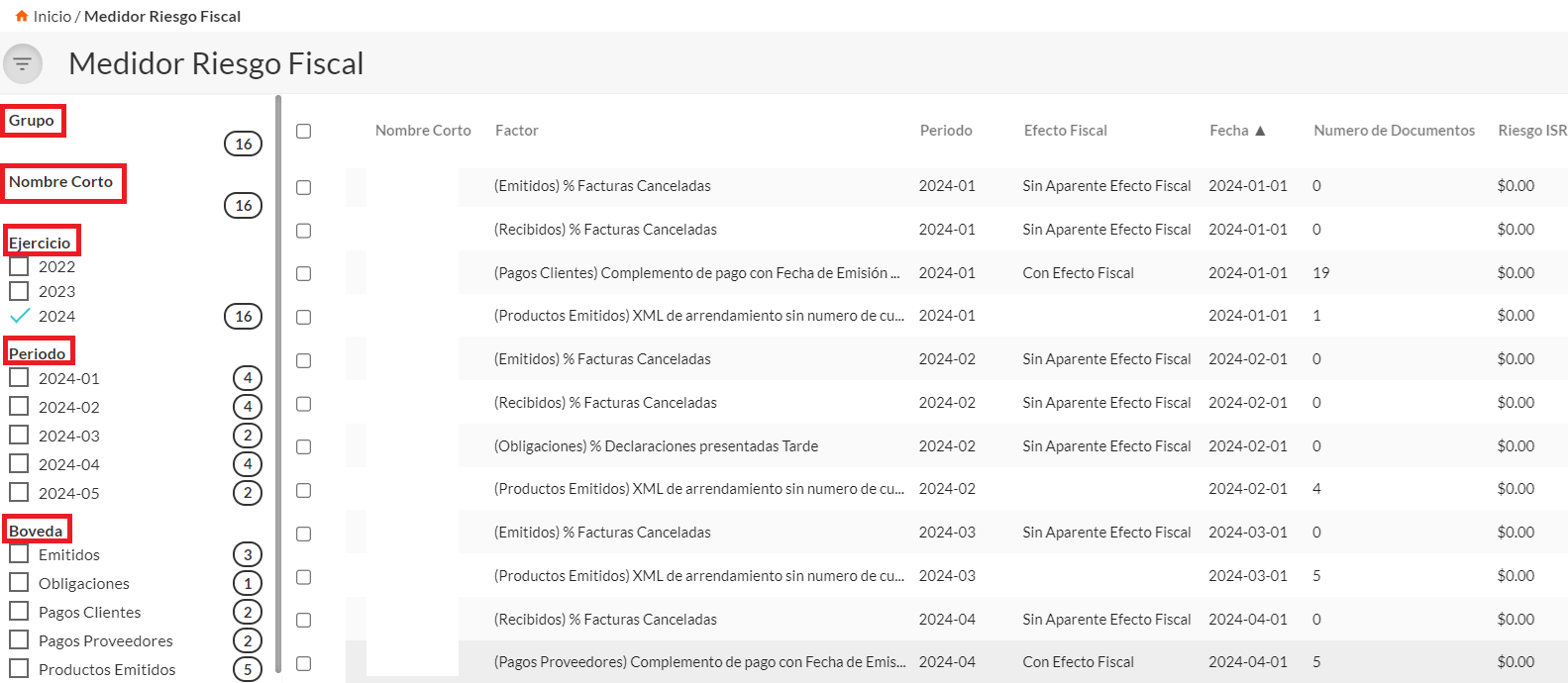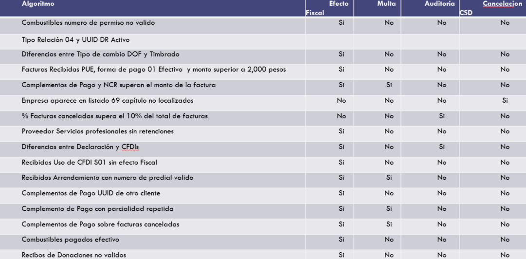 Estos son algunos algoritmos de riesgo fiscal que puedes encontrar en el medidor de riesgo.
