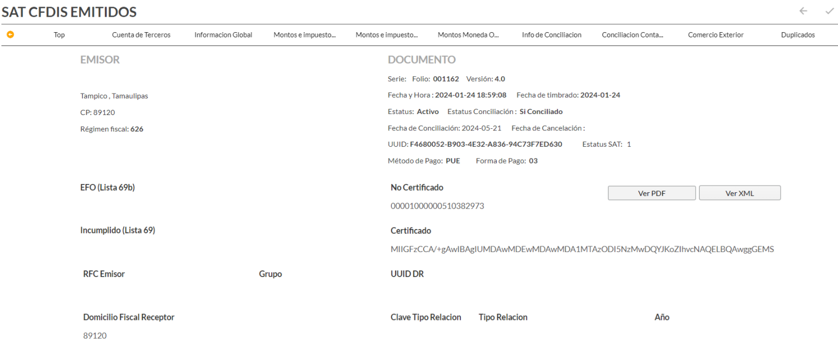 Dentro del detalle se te mostraran los campos de factor, periodo, nombre corto, RFC receptor, razón social receptor y UUID.