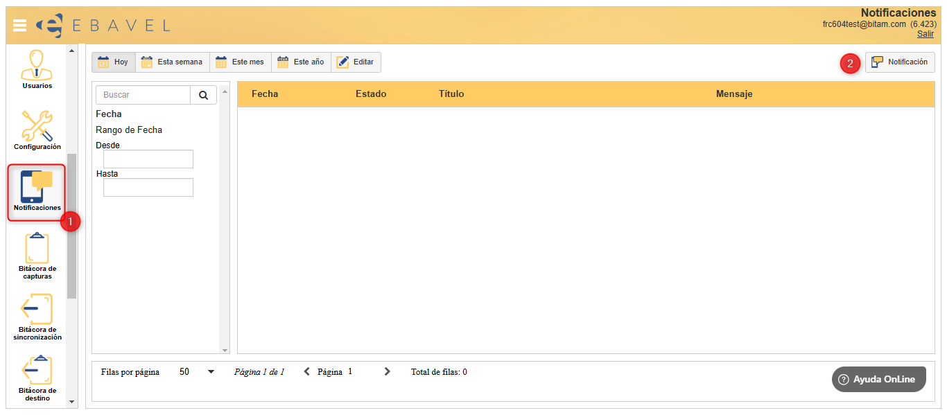 Para enviar mensajes ingrese desde el administrador a la opción Bitácora de Notificaciones (1) y haga clic en el botón de Notificación ubicado en el lado superior derecho de la interfaz (2):