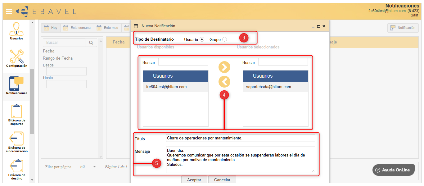 En la nueva ventana le aparecerá un listado de los usuarios o grupos que están activos en la aplicación dependiendo del tipo de destinatario que elija (3). Deberá mover los usuarios o grupos que aparecen de lado izquierdo al derecho que serán los que reciban la notificación (4) así como llenar los campos Titulo y Mensaje que serán enviados al usuario (5). Una vez completado lo anterior podrá dar en Aceptar para enviar la notificación.