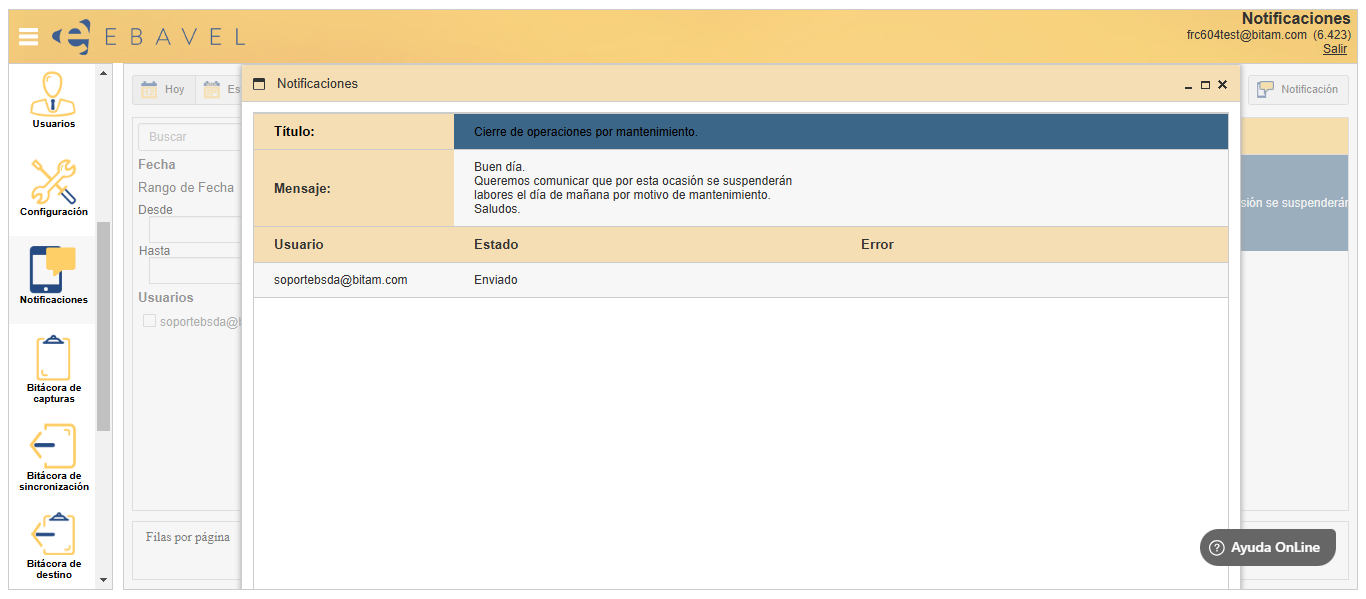 Esta funcionalidad consiste en el envió de notificaciones hacia un usuario o un grupo de usuarios desde el administrador. El administrador puede enviar mensajes en forma de notificaciones a sus usuarios para informar sobre alguna situación, pero estos no podrán responderle.